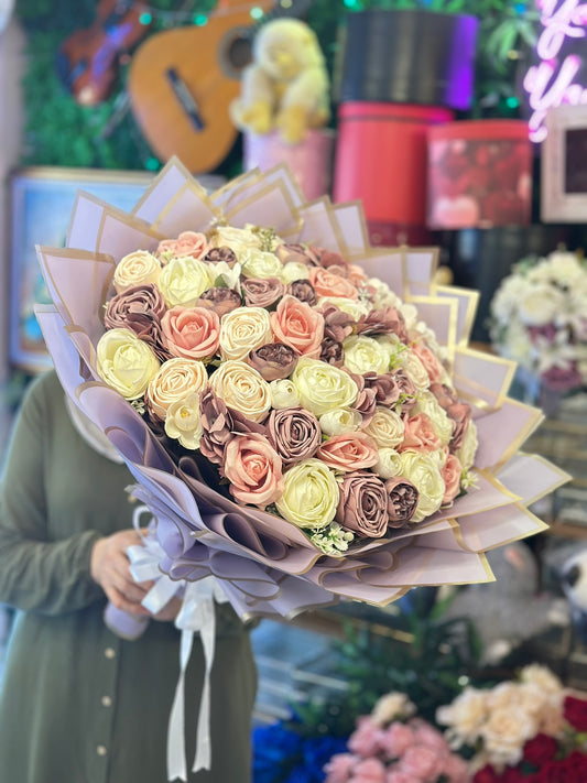 Pudra Tonlarında Kalıcı Sabun Gül Buketi – Zarif & Uzun Ömürlü Güzellik
