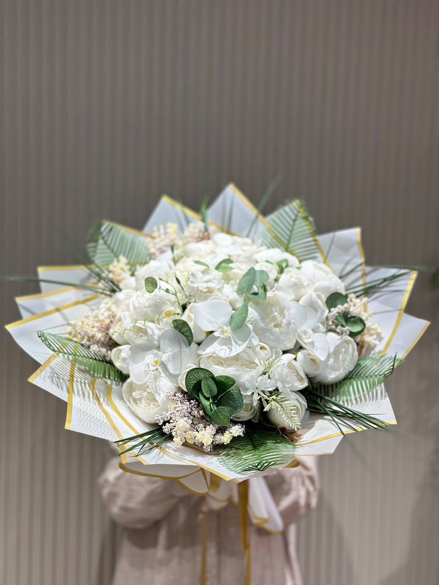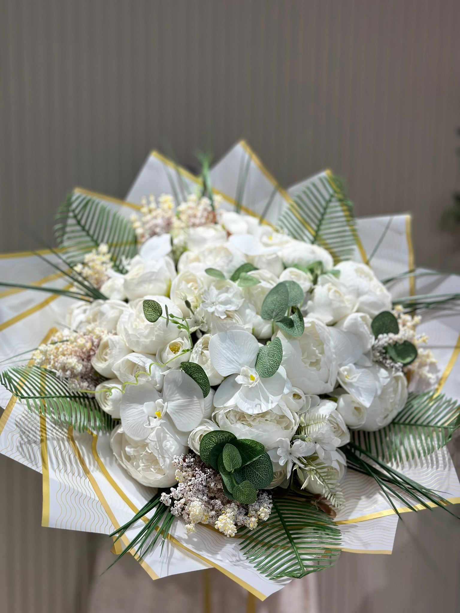 Beyaz Gül, Orkide ve Şakayık Buketi – Lüks ve Zarif Tasarım